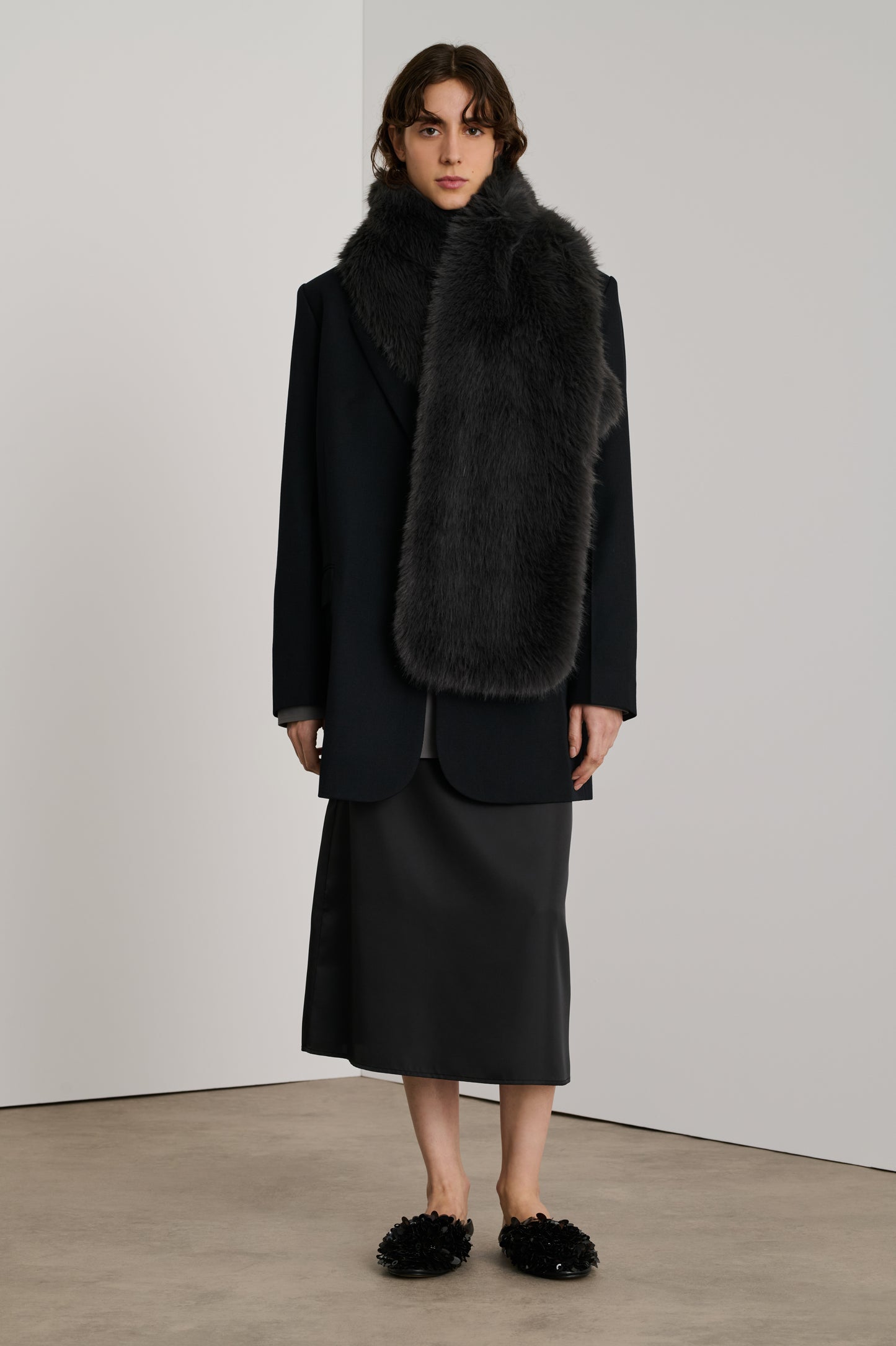 RUBY est une écharpe en fausse fourrure. D'une couleur anthracite foncé, au poil volumineux, ce col se porte par-dessus une veste de blazer ou chemise pour réchauffer une tenue d'hiver.