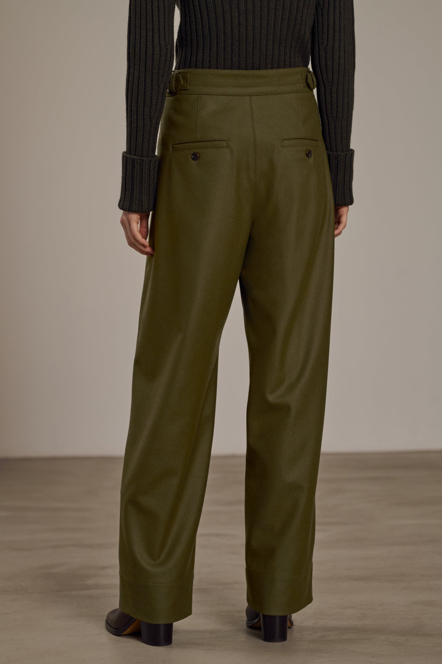 WALLY est un pantalon taille haute. Ses pattes de serrage permettent d'ajuster la taille. Un grand revers permet de le porter retroussé pour une silhouette bien droite, ou détroussé pour une silhouette oversize et décontractée. En flanelle de laine, douce et souple, il est parfait pour le plein hiver.