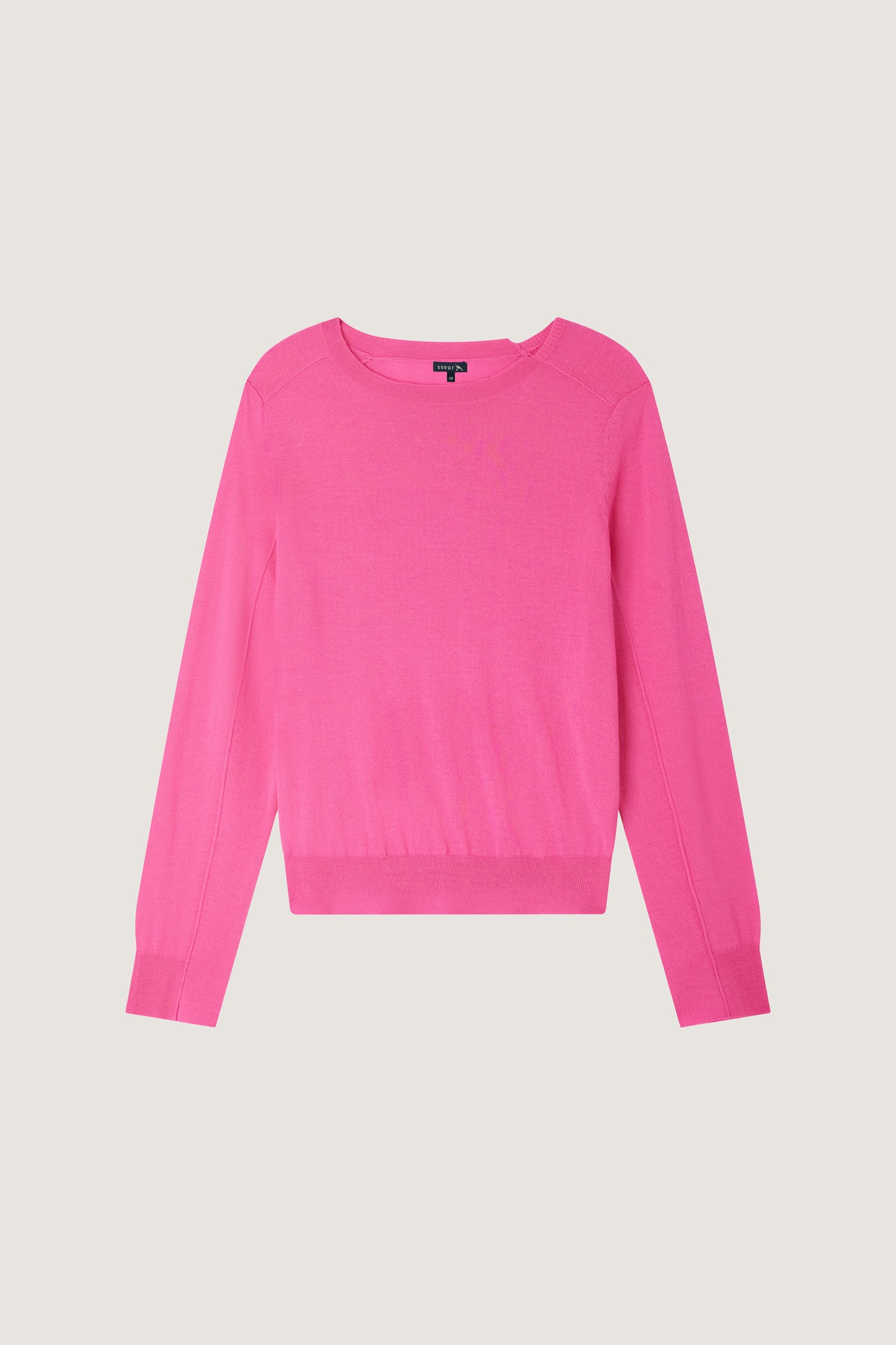 Pull manches longues rose en laine mérinos extra-fine aux finitions asymétriques
