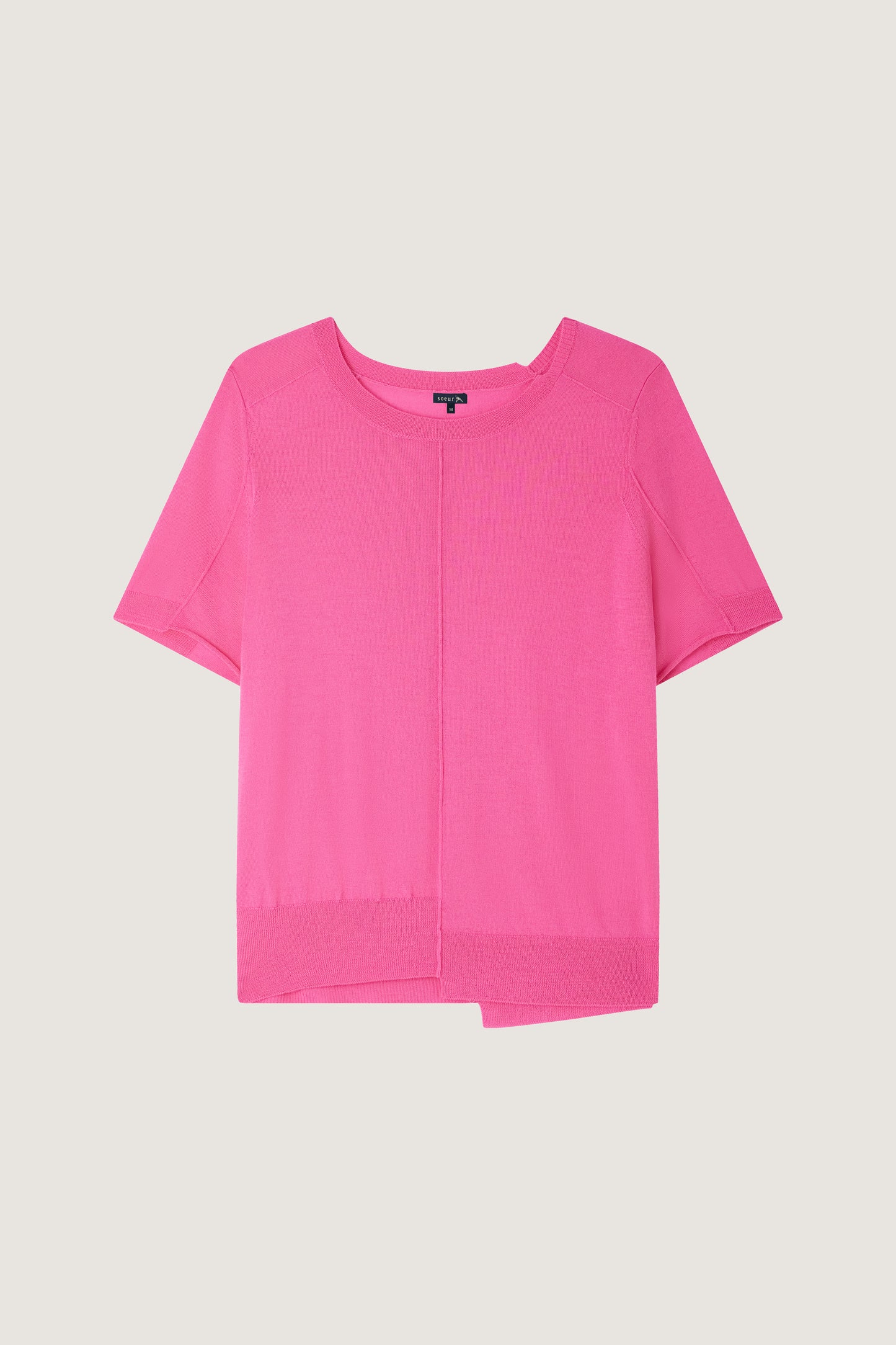 Pull manches courtes rose en laine mérinos extra-fine aux finitions asymétriques